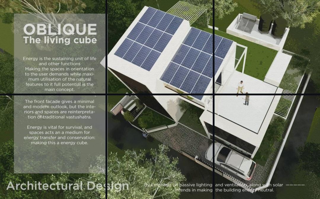 Making the spaces in orientation to the user demands while maximizing utilization of the natural features to its full potential is the main concept.The front facade gives a minimal and modern outlook, but the interiors and spaces are reinterpretation of traditional vastushatra.Energy is vital for survival, and spaces acts as a medium for energy transfer and conservation, making this an energy cube.